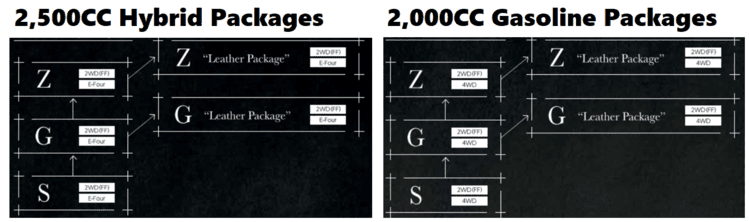 There are three main packages available from Hybrid and Gasoline. The leather seat option is available with Z and G packages.