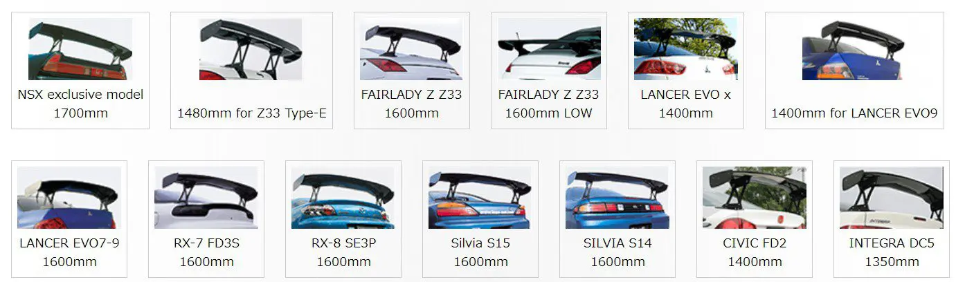 There are 2 types of material, lightweight & high strength dry carbon type and suitable wet carbon type, and 4 types of wing widths of 1,350/1,400/1,500/1,600mm are available. With a wide variety of car models, you can choose the WING that suits your driving purpose and user preferences.