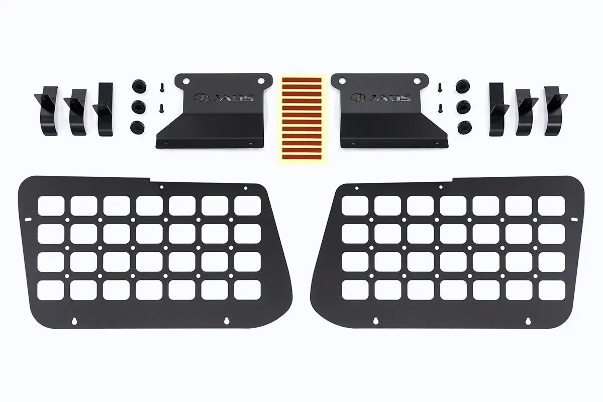 This steel storage panel is compatible with the MOLLE system and is attached to the inside of the quarter window. Utilizing the square and round holes on the main body, you can securely attach your favorite outdoor gear and tools. It neatly organizes the luggage space, which tends to get cluttered, and allows it to be freely arranged by purpose. It is an item that makes everyday driving more enjoyable by creating a unique interior space.