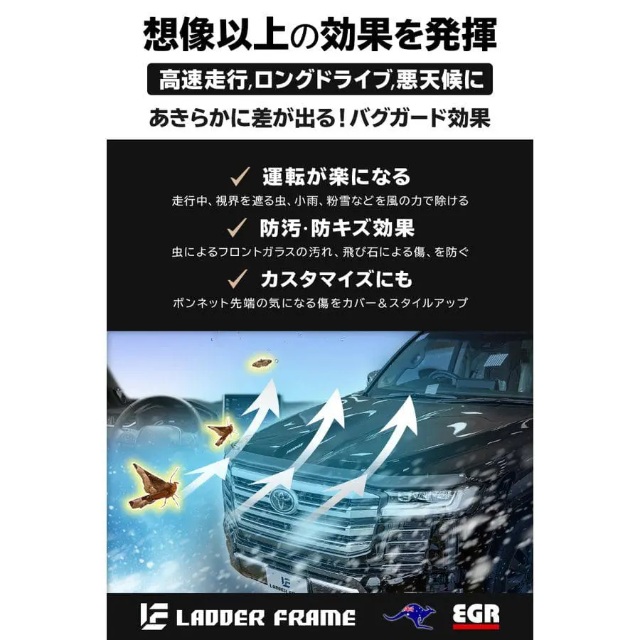 Keeps “insects” away from the windshield while driving at high speed, and the way it gets dirty when driving for a long time is clearly different! Since it has a rectifying effect, it is effective even in light rain and powder snow. It can also be used to hide scratches on the tip of the bonnet caused by stepping stones.