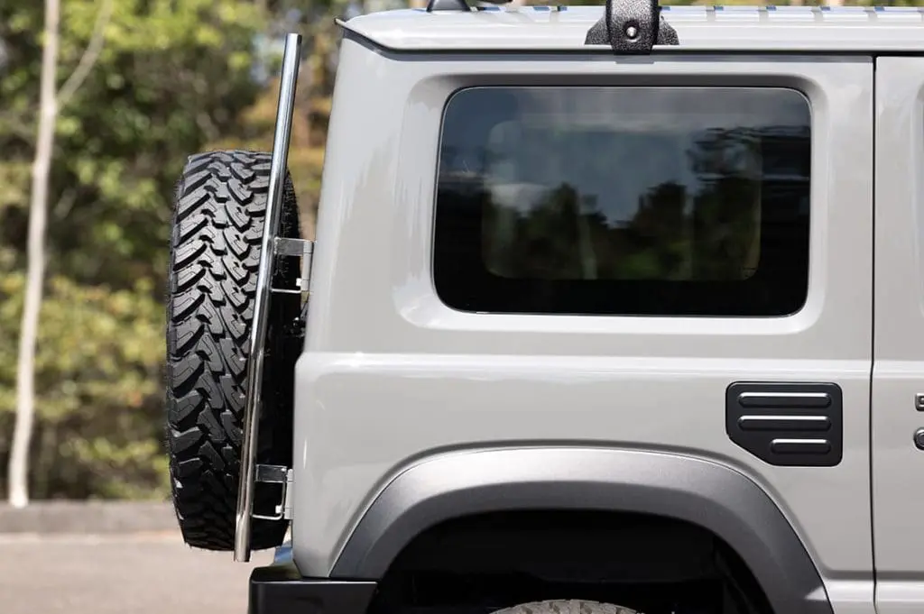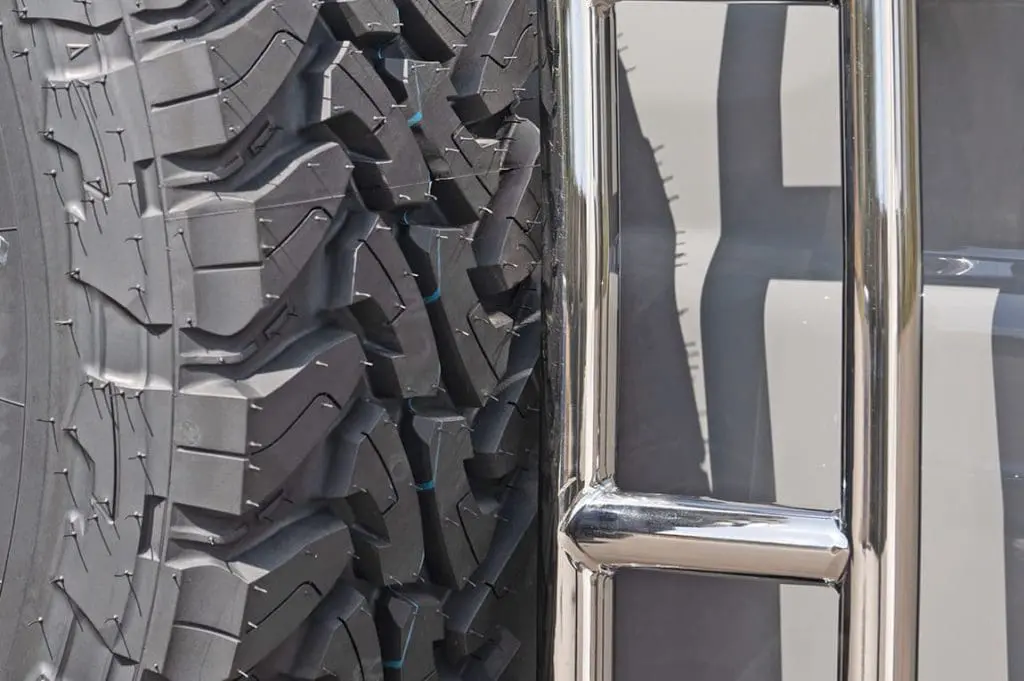 Combination of TOYO OPEN COUNTRY MT 225/75/R16 and our spare tire movement kit (movement to the right: 82mm, upward: 106mm). Measure from the outer circumference of the tire to ensure a clearance of approximately 5mm. The width of the footrest (the part you put your foot on) is approximately 95-98mm. *There may be slight differences depending on the product.