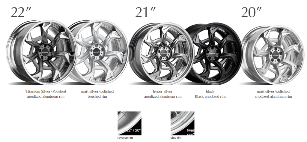 “VORSALINO”, WALD’s New Masterpiece is released in the market now. The Multi-Piece wheel construction which can be set up with the ideal width, inset, and even the color combination for the disk and rim for the high-end cars is given to VORSALINO. The design Source was inspired by the Gear and the Seven-Spoke-Design shows the typical character of this wheel with the strong impact. The available size is 22 inches, and the color can be picked up from Titanium Silver Polish as the basement color with two different style rims. To match with the request from high-end car owners, VORSALINO can be accepted the Option Color Disk/Rim to create a difference from others.